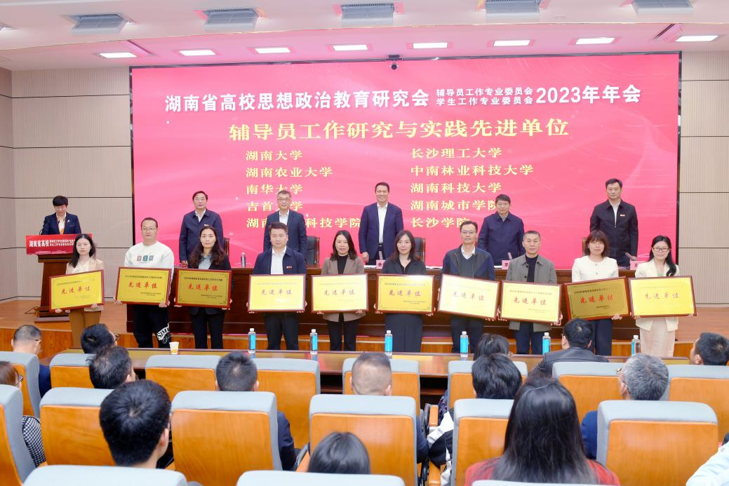 会议现场表彰了2023年湖南省高校辅导员工作研究与实践先进单位、学生工作研究与实践先进单位。湖南工程职业技术学院、 湖南科技学院分别作为先进单位代表作经验分享。