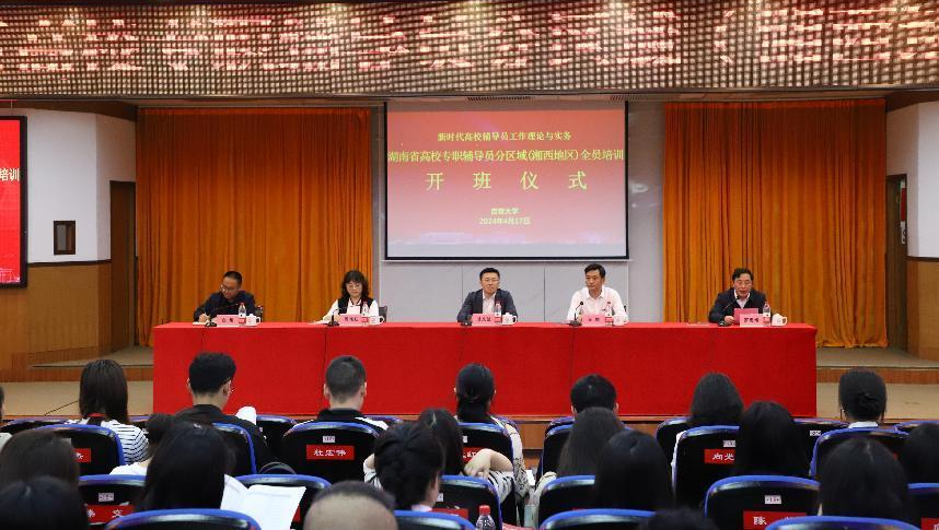 为深入学习贯彻党的二十大精神,不断提升高校思想政治工作质量,落实教育部《普通高等学校辅导员队伍建设规定》等文件精神,提升全体辅导员的思想政治工作能力和专业素养,4月17日上午,由中共湖南省委教育工委、湖南省教育厅主办,我校承办的湖南省高校专职辅导员分区域(湘西校区)全员培训班如期开班。开班仪式在我校砂子坳校区模拟法庭举行,省委教育工委宣传部部长、省教育厅思政处处长甘文波,湖南女子学院党委委员、副校长周艳红,湘西民族职业技术学院党委委员、副校长白刚,以及我校党委副书记王绯,党委委员、副校长罗惠缙出席,罗惠缙主持开班仪式。