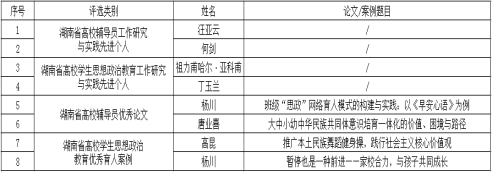 经评委小组共同评审,拟推荐汪亚云等4位同志参加2021年度湖南省高校辅导员工作研究与实践先进个人和湖南省高校学生思想政治教育研究与实践先进个人评选;拟推荐杨川等4位同志的优秀论文及育人案例参评2021年度湖南省高校辅导员优秀论文和湖南省学生思想政治教育优秀育人案例评选。具体情况如下: