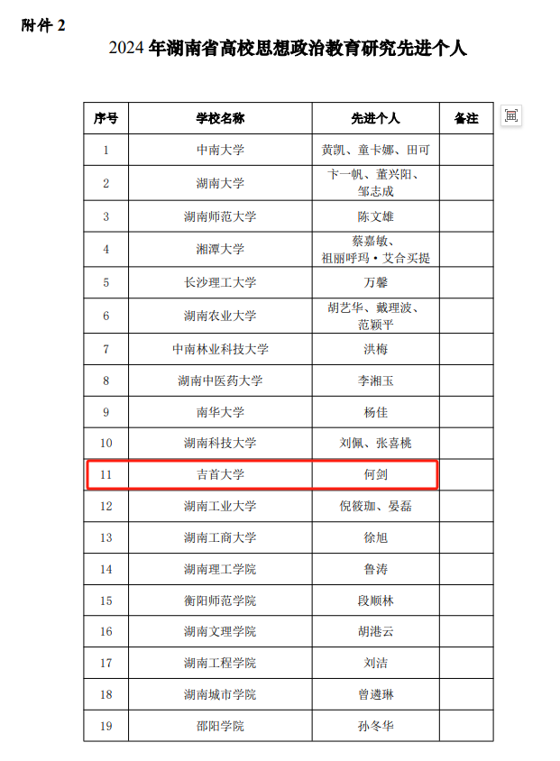 本网讯(闫慧远)近日,湖南省高等学校思想政治教育研究会对2024年全省高校思想政治教育研究先进单位、先进个人、优秀论文、优秀案例等进行表彰,william威廉亚洲(中国)有限公司等17所高校荣获“2024年湖南省高校思想政治教育研究先进单位”,我校计算机科学与工程学院何剑老师被评为“先进个人”,研究生院彭立平老师获评“优秀论文”二等奖。