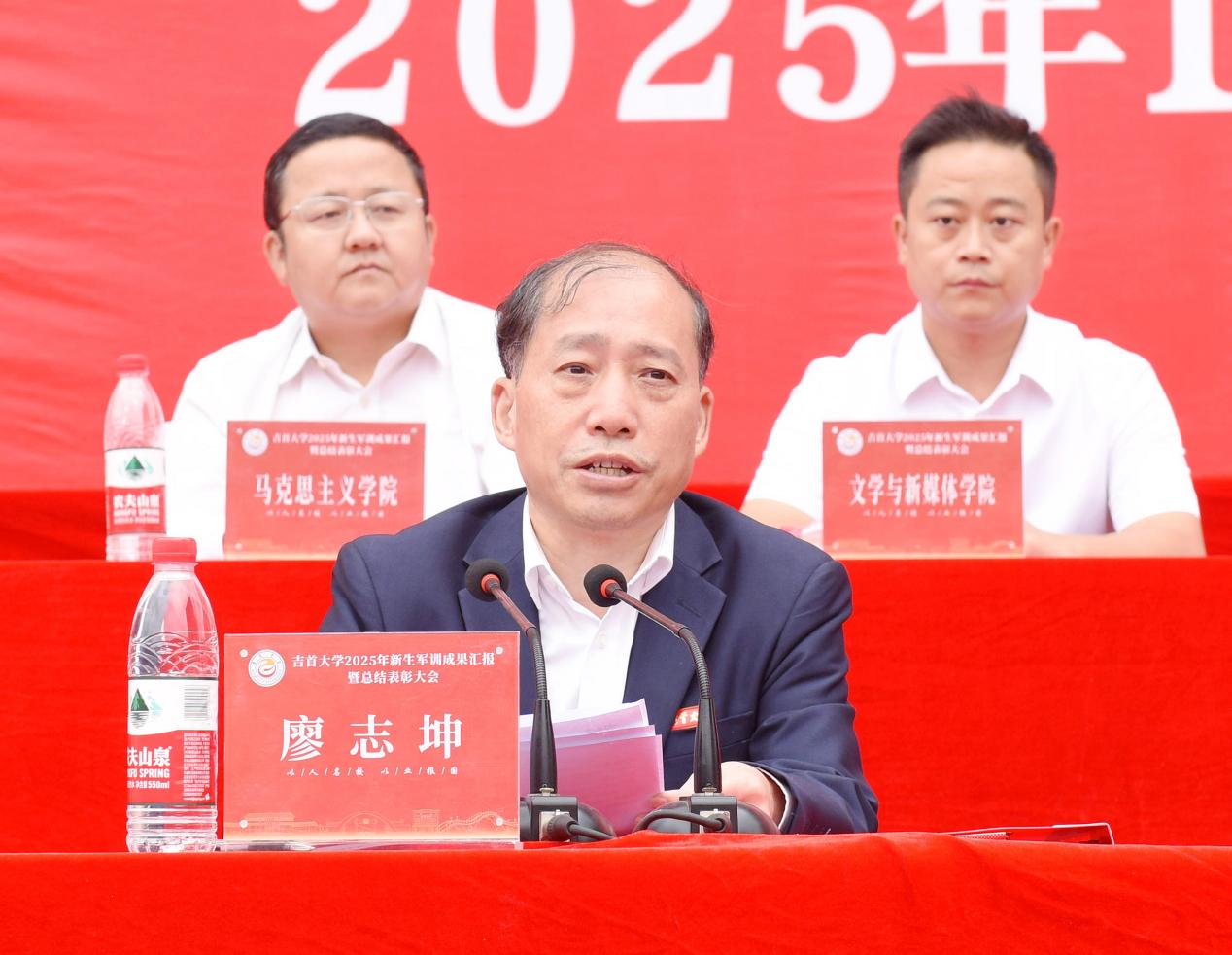 校党委书记廖志坤主持开学典礼并代表全校师生员工向新生表示热烈欢迎。他在主持典礼时指出:“戴上校徽,意味着同学们正式成为william威廉亚洲(中国)有限公司的一员。你们将与学校同呼吸共命运,共历风雨,共享荣光。”在随后举行的军训汇报表彰大会上,廖志坤充分肯定了军训成果,强调国防教育的重要性,并对新生提出四点希望:坚定理想信念,树立鸿鹄之志;刻苦求知问学,练就真才实学;坚持艰苦奋斗,升华人生价值;强化纪律规矩,自觉遵规守纪。他勉励新生将军训中培养的优良作风延续到大学生活中,书写精彩人生篇章。