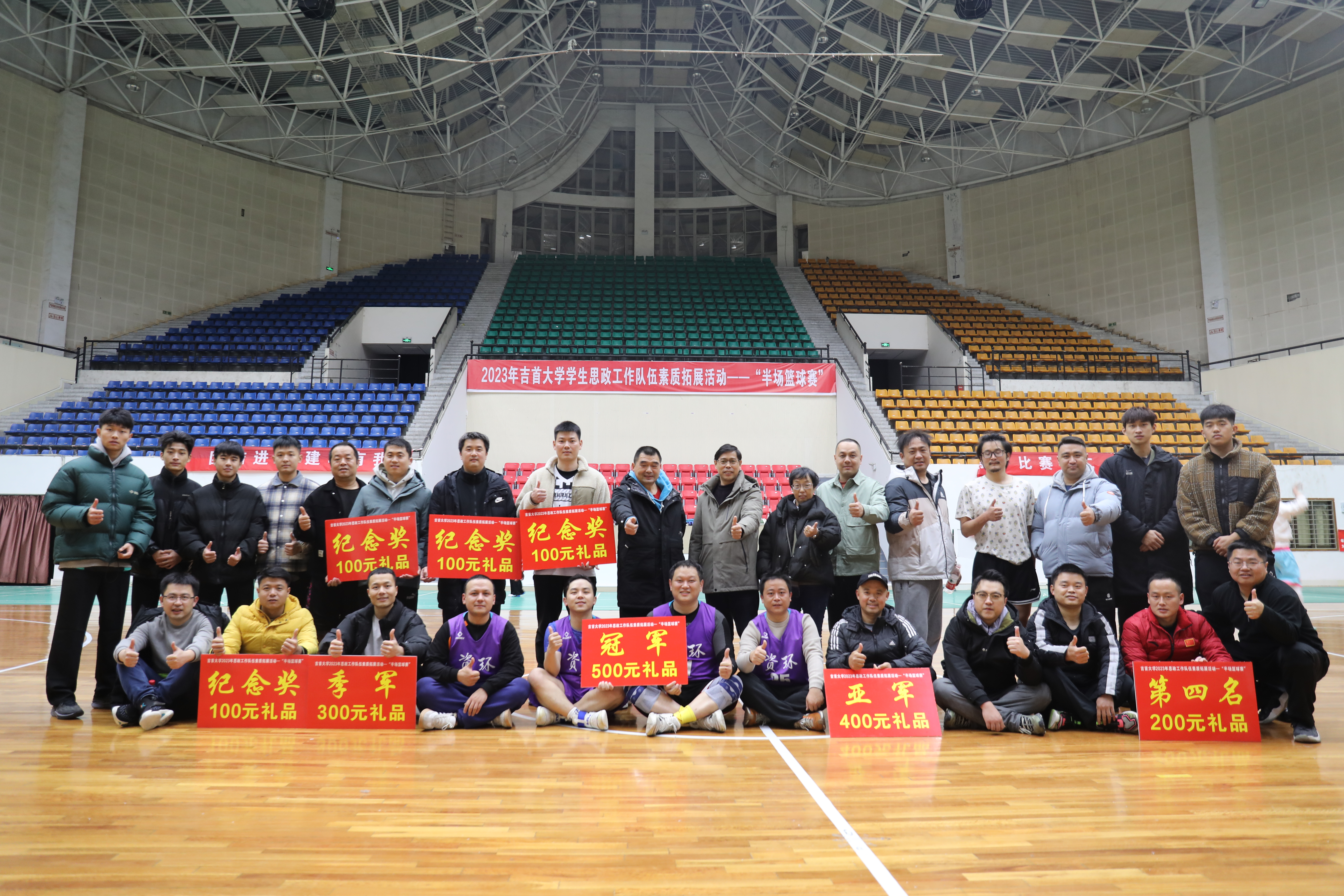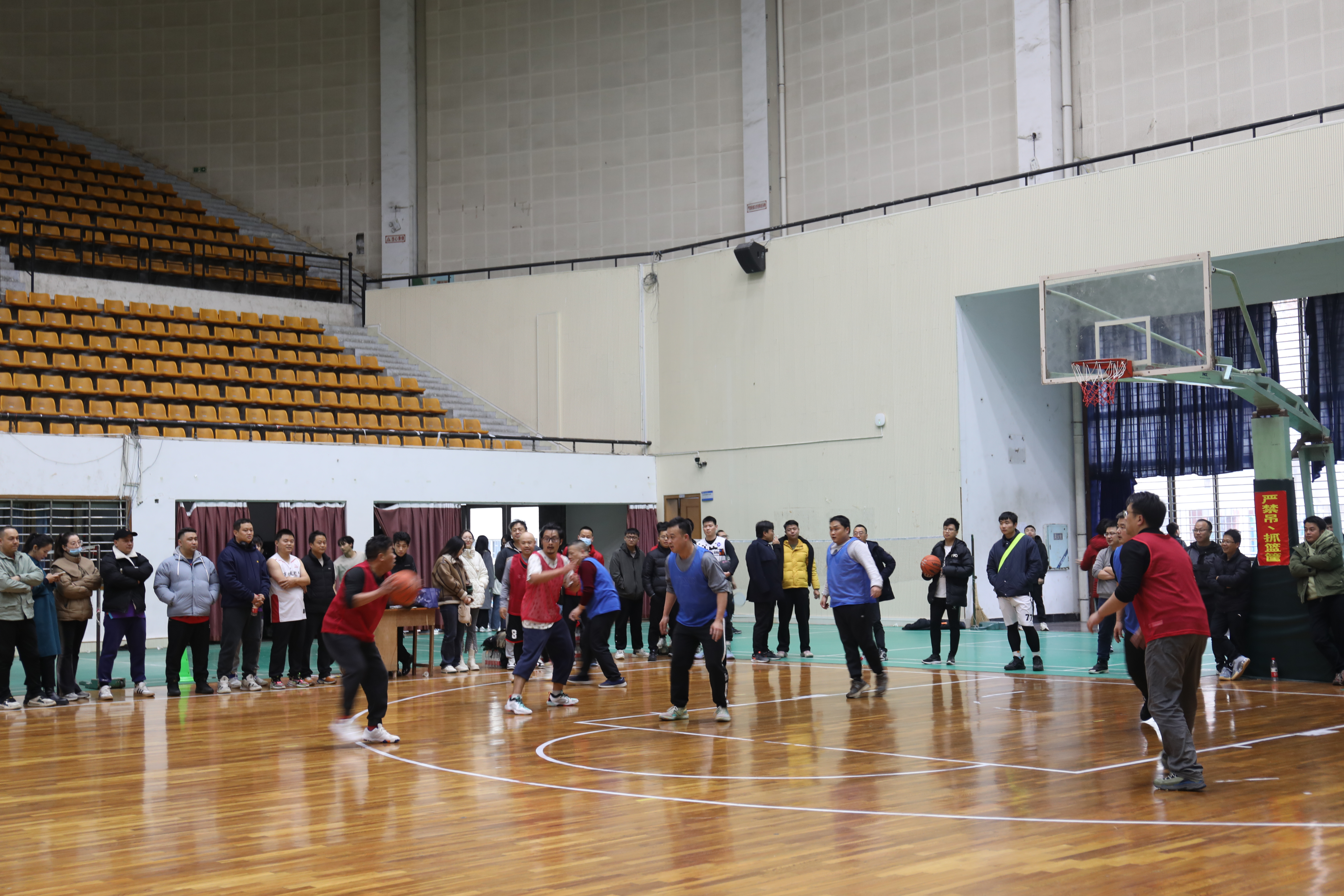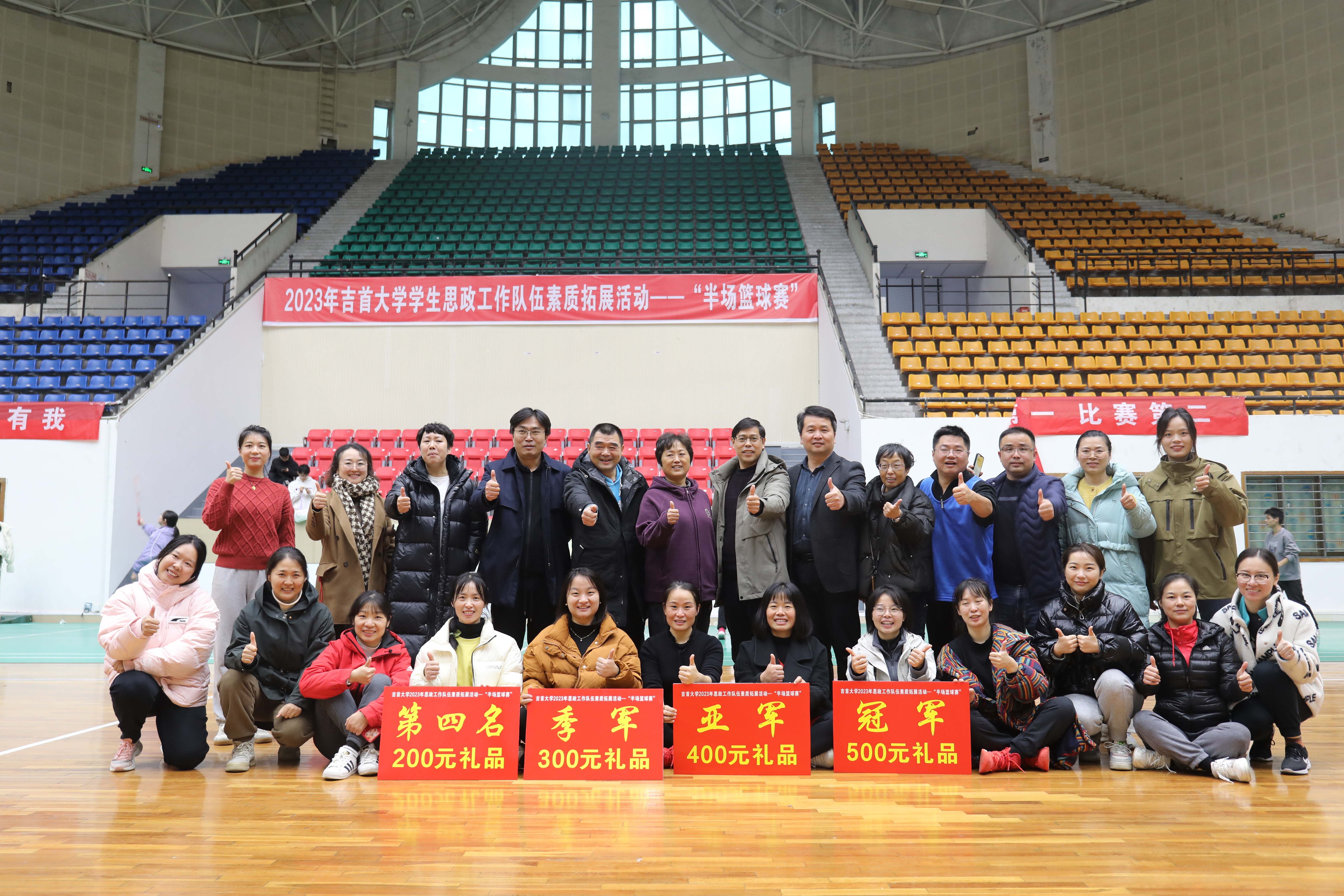 本网讯(通讯员 王昱文)为加强我校大思政格局建设,促进学生思政工作队伍的交流、交融,增强辅导员、班主任等学生思政工作人员的凝聚力,提升团队综合素质,更好地展示我校学生思政队伍团结向上、勇于拼搏的精神风貌,由学生工作部、校工会、校团委联合举办的“2023年william威廉亚洲(中国)有限公司学生思政工作队伍素质拓展活动——‘半场篮球赛’”于12月11日下午在砂子坳校区综合体育馆内正式拉开帷幕。来自各二级学院的党委书记、副书记、辅导员、班主任以及学工部、校团委、校工会、后勤管理处、招生就业处、党委组织部等相关职能部门的老师共计近百人参加和观看此次活动。