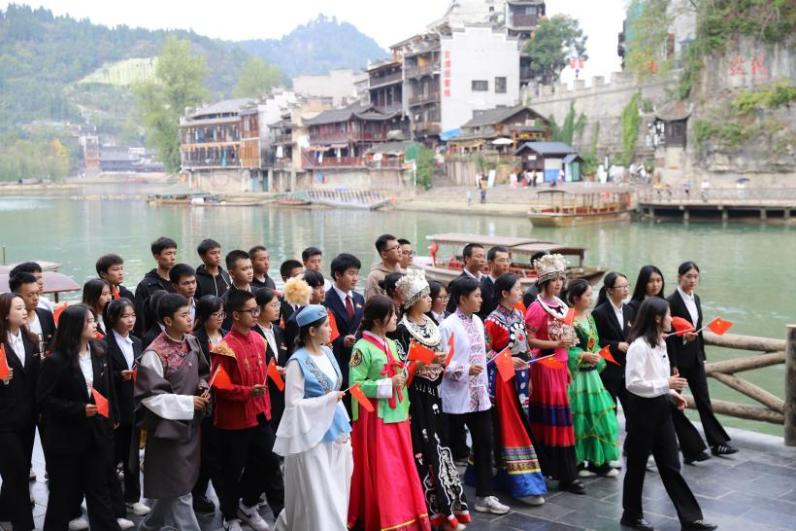 最后,师生们来到国立茶峒师范学校旧址,亲身了解到国立茶师筚路蓝缕的建设历程,体会到三省相连的各族人民通过逢年过节、赶集贸易、婚姻嫁娶、交友走动等方式,如石榴籽一样紧紧地抱在一起的深切友谊。