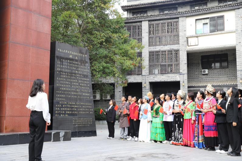 师生们肃立在走向大西南纪念碑前,阳光下邓小平同志题写的“走向大西南”五个大字熠熠生辉。袁建平带领大家重温刘伯承、邓小平率领第二野战军挺进大西南时留下的光辉历程。