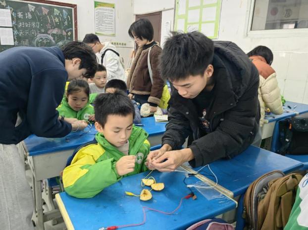 本网讯(黄思琪)11月22日,物理与机电工程学院“科学奇趣社”的志愿者们走进砂子坳小学,以深入浅出、妙趣横生的科普课堂为载体,以“电的秘密”为主题,采用知识讲解、动手实验等趣味方式,大手拉小手,共同探寻“电”的秘密。小学生们在志愿者的引导下认识电、理解电,体会到科学的魅力。